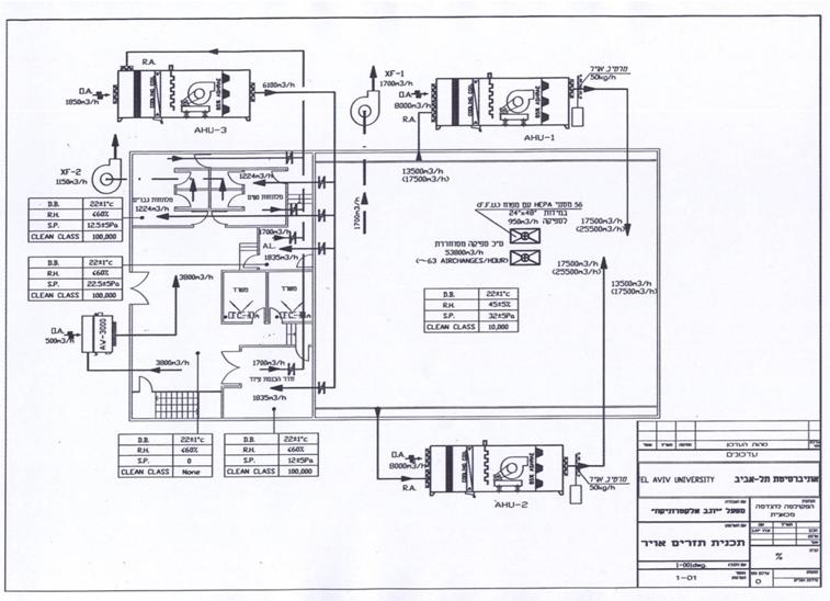 . בתקרת האולם יותקנו יחידות מסנני HEPA עם מאווררים F.F.U (Fan Filter Unit ) בכמות הנדרשת על פי סה"כ הספיקה הנדרשת לסחרור 68,500